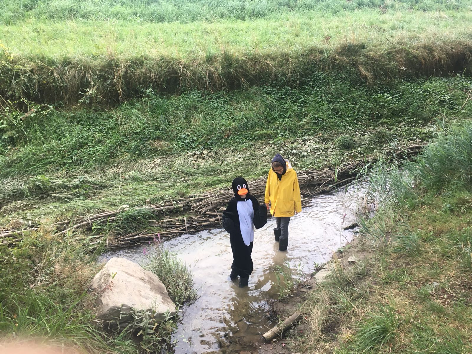 Pingu und Suki, mit Gummistiefeln im Fluss.